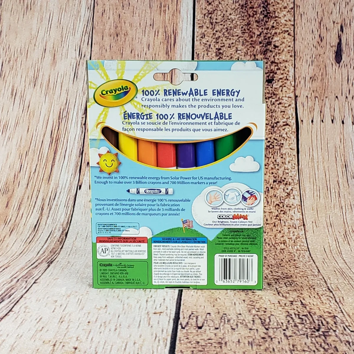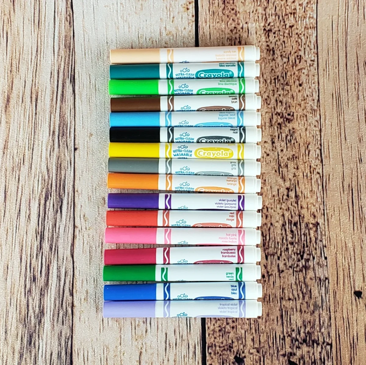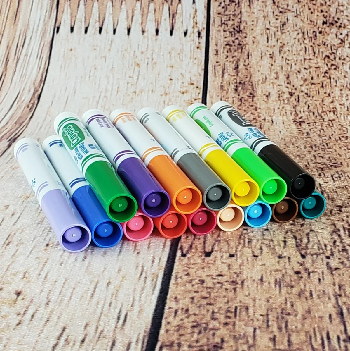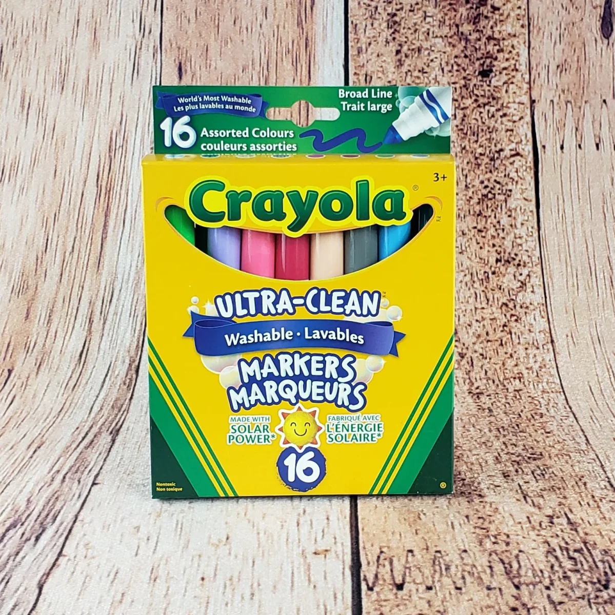16 crayons feutres à pointe large lavables de marque Crayola.