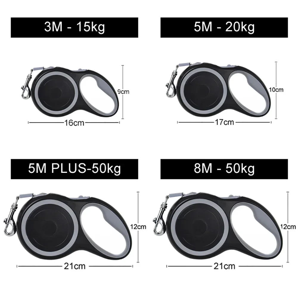 - 8M convient pour le poids d’animal jusqu’à 50kg longueur de laisse 5m, largeur du cordon 1,5 cm.