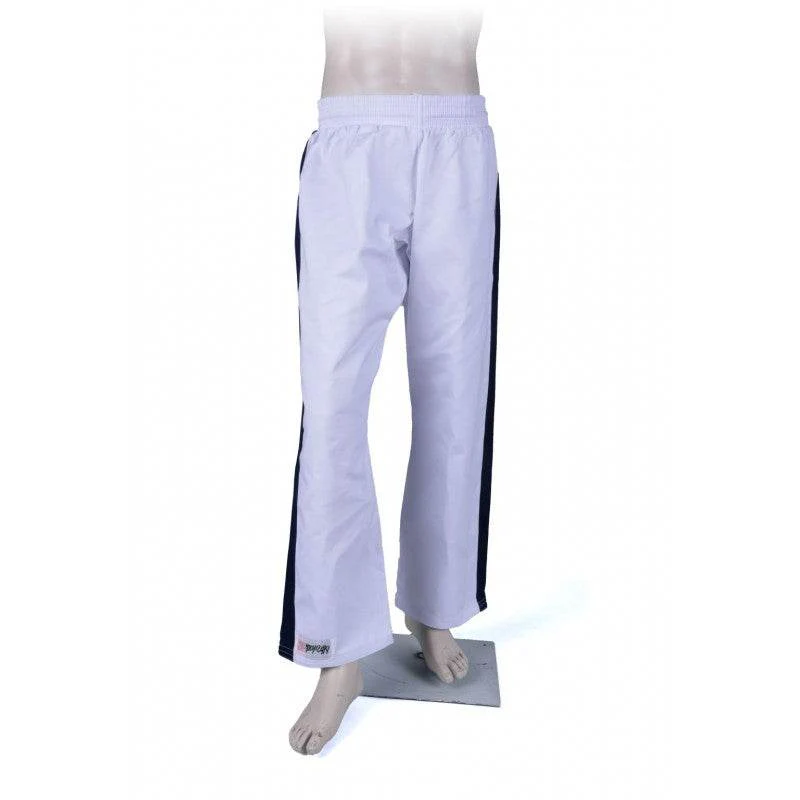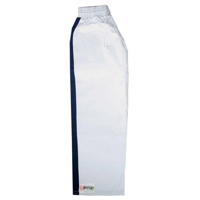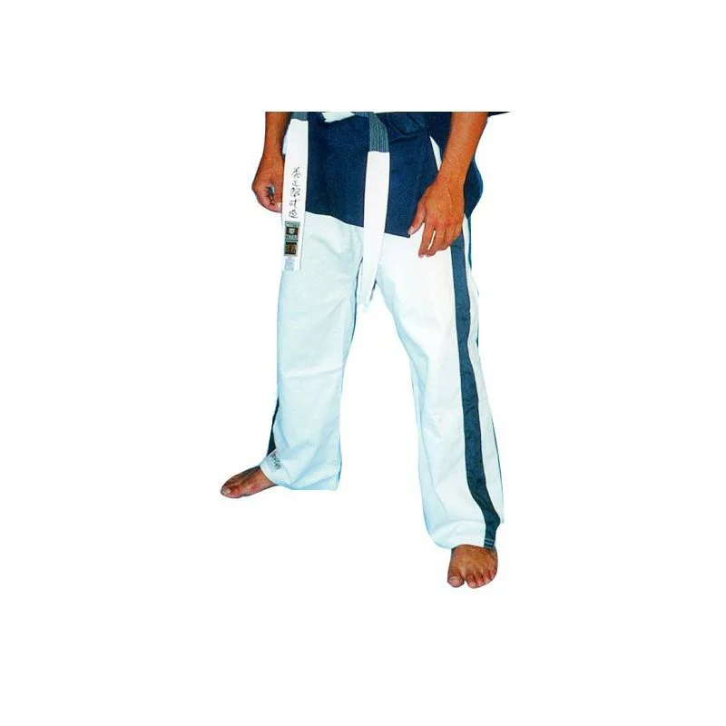 Pantalon Yoseikan Budo Noris Blanc Bandes Bleu Nuit Coton