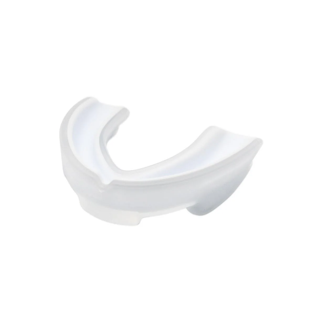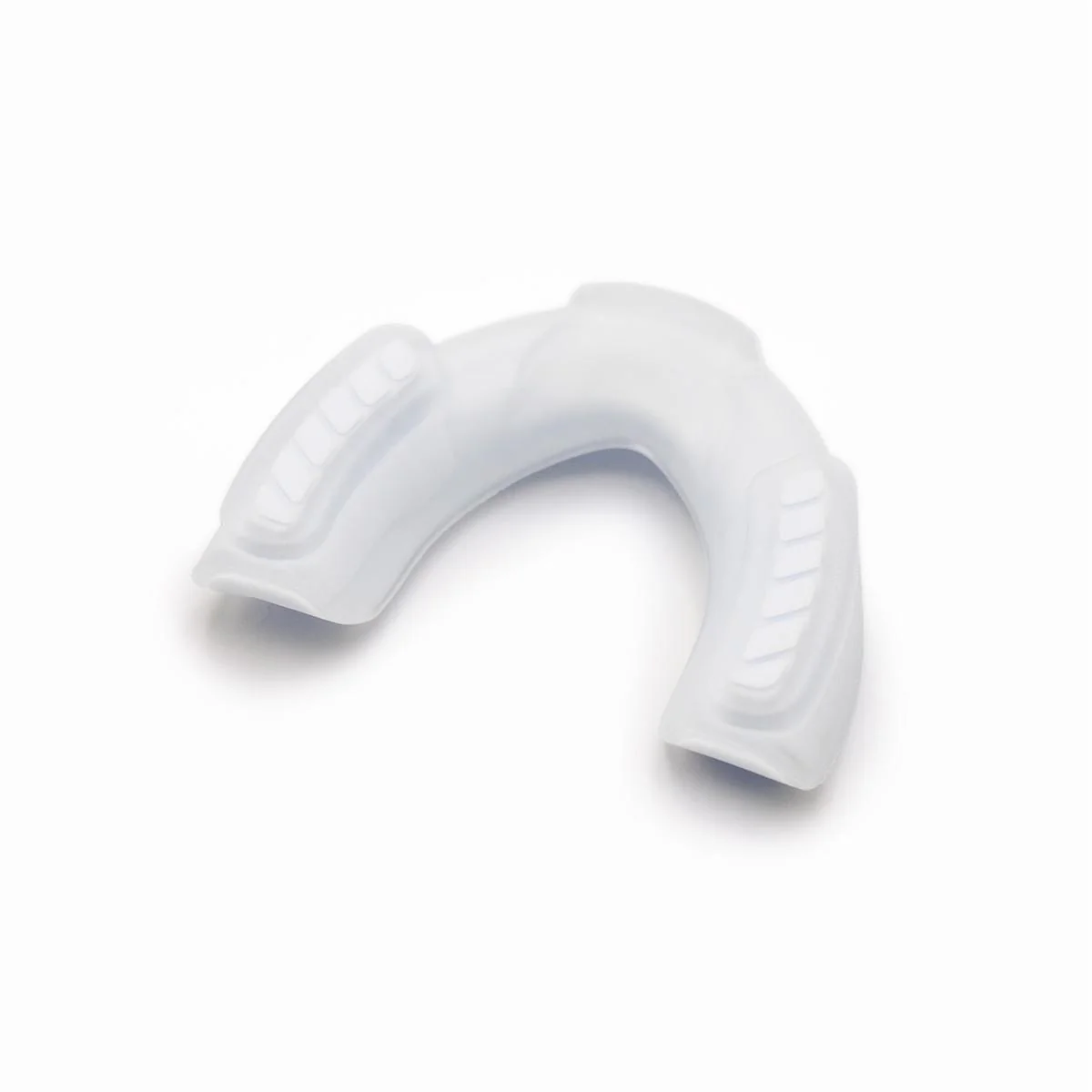 Protège-dents simple triple couches qui s’adapte plus facilement que les protège-dents classiques grâce à sa couche supérieure de gel et une couche thermo formable de couleur se moule sur vos dents et améliore l’absorption des ondes transmises lors des impacts.