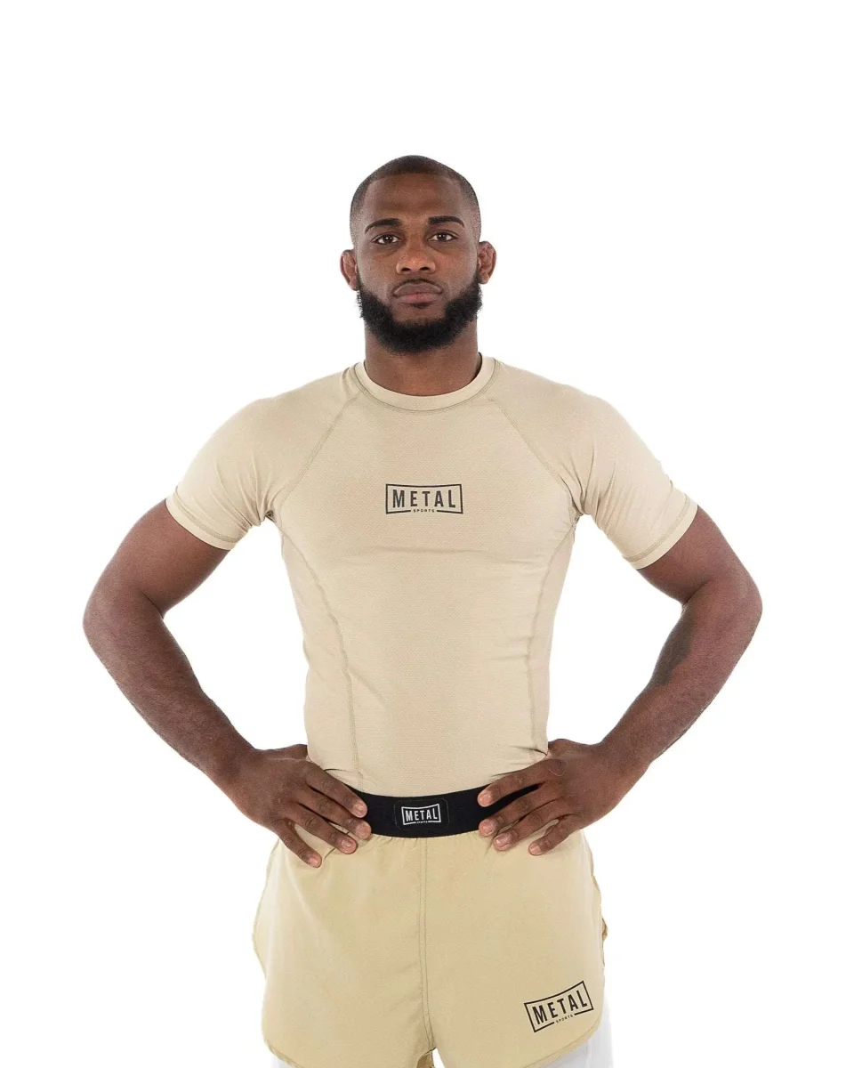 Faisant partie de la gamme textile Metal Boxe, ce rashguard associe sobriété et efficacité. Disponible en quatre coloris – beige, Miami Vice, noir et olive – il s’accorde parfaitement avec un short de MMA ou une tenue complète Metal Boxe.